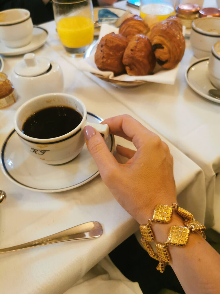 Breakfast is served in the same room that in the evening changes to the Champagne bar. It’s very stylish and reminds me a bit of Ladurée aesthetics. With soft green and gold colours. Tables have white cloth on them it adds a lovely touch. There are pastries to choose from, of course, there were the signature croissants. We ate them with delicious butter ( it was truly exceptional) and jams.