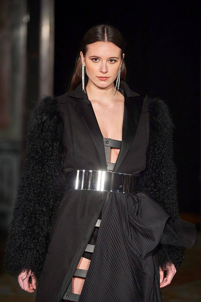 Her collection shows signature stainless steel accessories combined with very architectural designs were very modern and feminine. “The entire collection explored the conceptualization of travel and the femininity in architecture within the city of Paris. Military inspired epliettes encrusted with crystals and studs, architectural draped gowns and stainless steel belted pieces that were captivating with design details such as cutouts as well as perfectly placed studs”. She has created striking silhouettes by layering textured fabrics, like Merino wool, tulle, and adding stainless accessories.